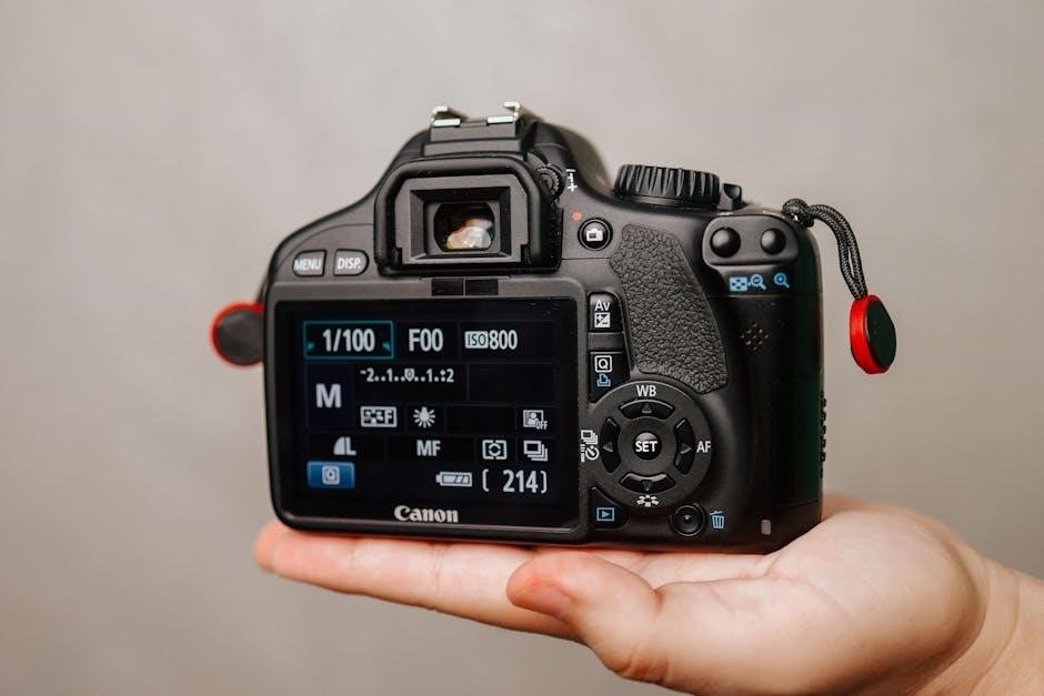 The display also shows focus points and shooting mode. Customization options‚ outlined in the manual‚ allow users to adjust the brightness and information displayed; Mastering the LCD screen’s interface is vital for reviewing images and making informed adjustments on the fly‚ enhancing the overall shooting experience.