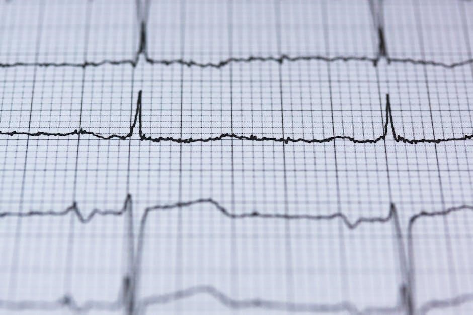 Proper electrode placement is critical for accurate EKG recordings․ Chest electrodes (V1-V6) are placed across the sternum and ribcage, while limb electrodes are positioned on the arms and legs․ Correct placement ensures clear signals and minimizes interference․ Dubin’s guide emphasizes avoiding movement and ensuring good skin contact․ Improper placement can lead to artifacts or poor trace quality, making interpretation challenging․ Adherence to standardized positions is vital for reliable and consistent EKG results, as outlined in the guide to help users achieve optimal recordings every time․